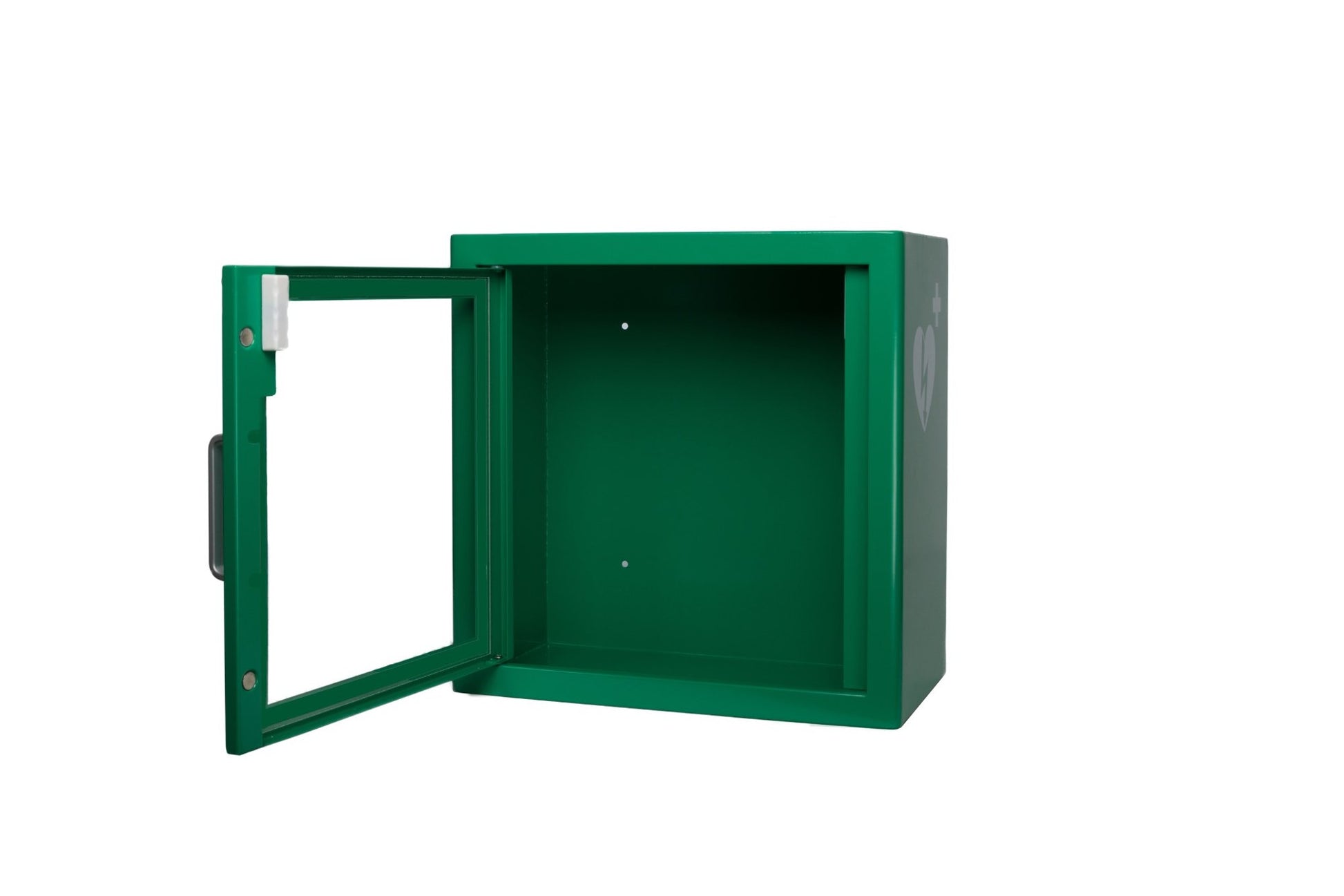Universell einsetzbarer AED-Schrank mit akustischem Alarm und robustem Metallgehäuse.