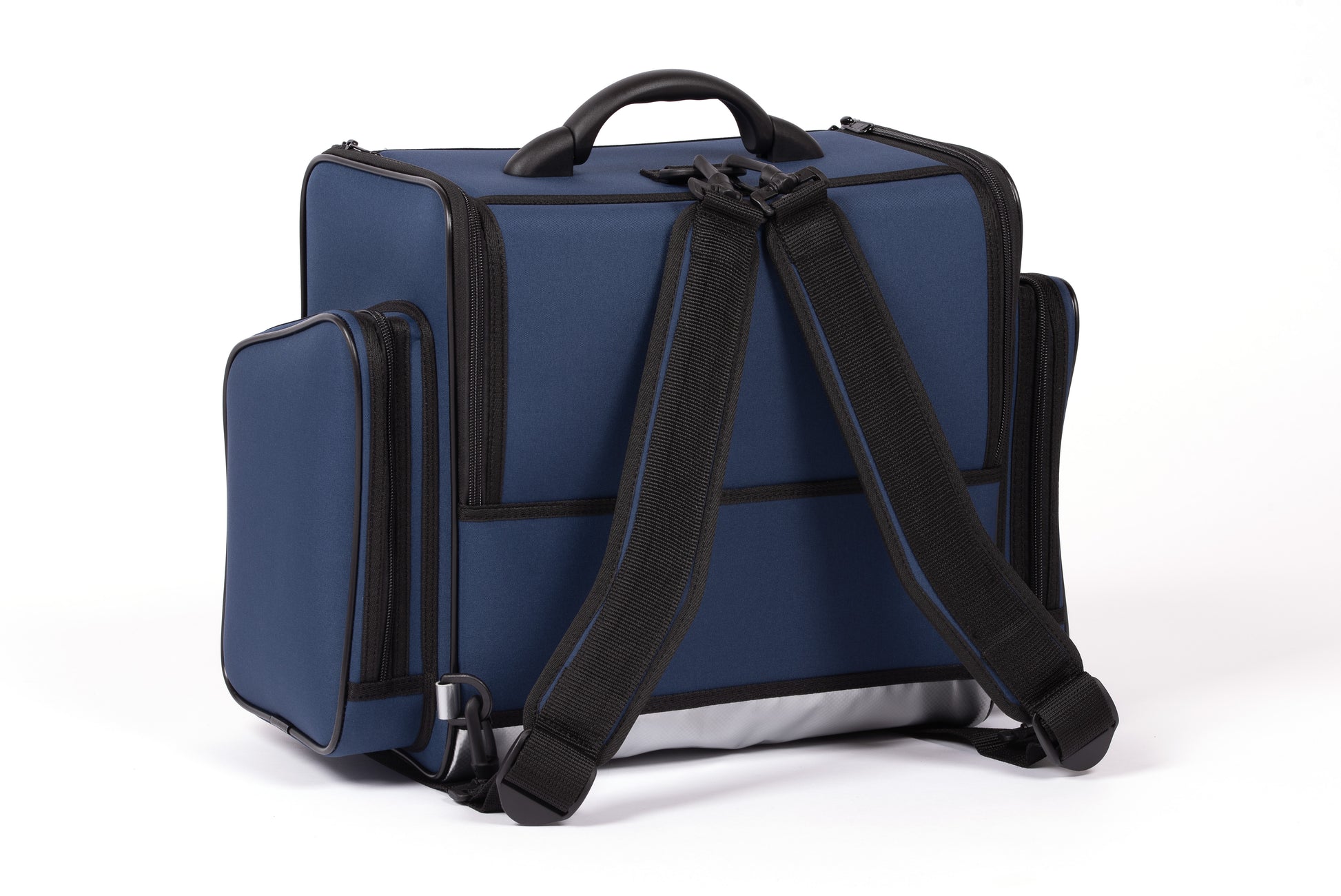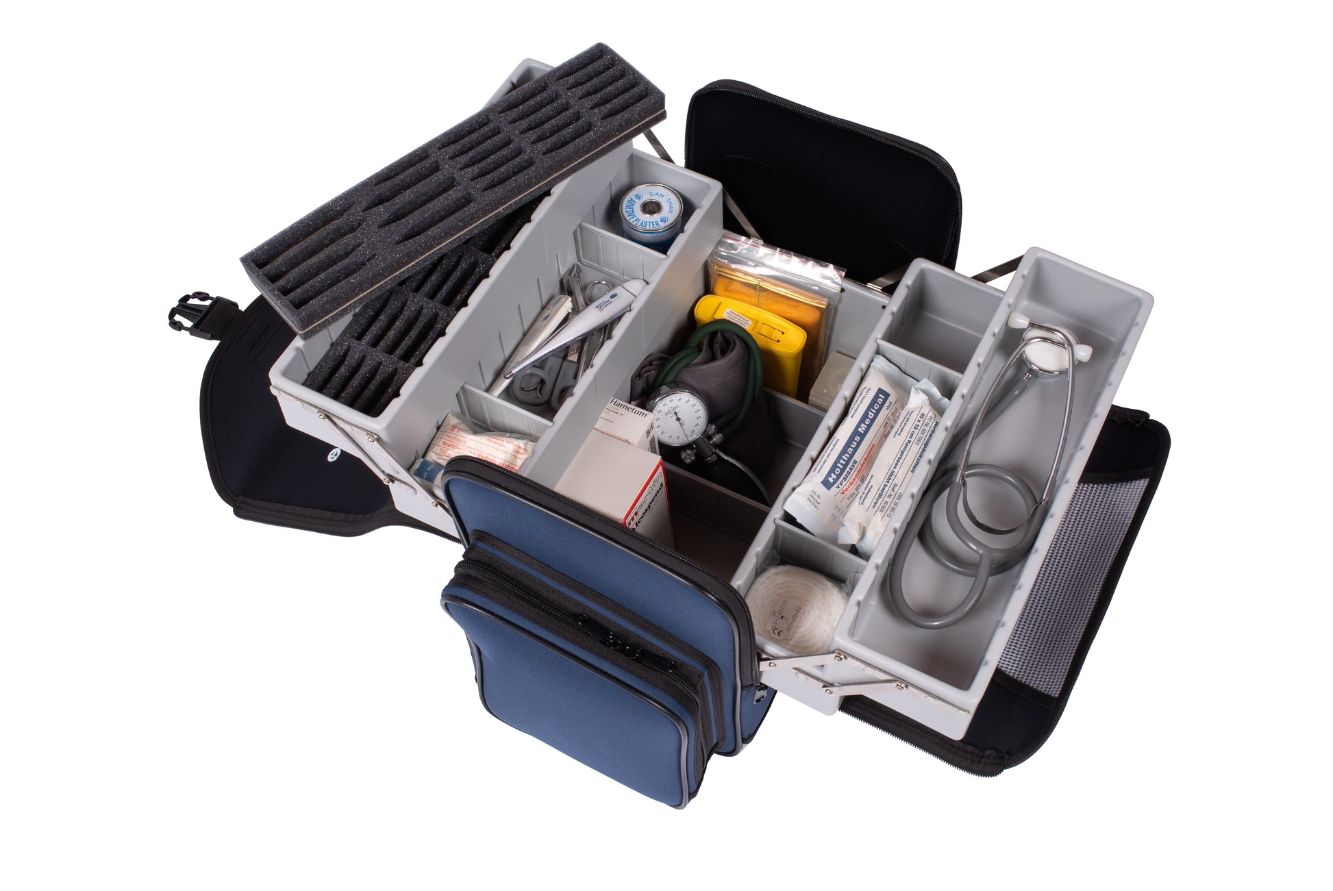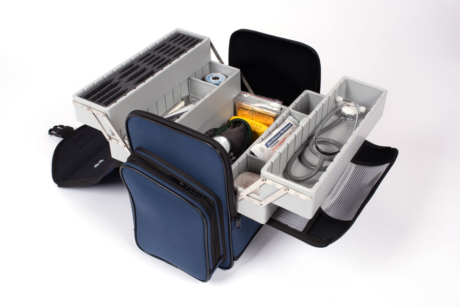 Flexible Besuchstasche mit seitlich ausziehbaren Fächern, Ampullenaufbewahrung und individuell anpassbarem Innenraum – ideal für den professionellen Pflegeeinsatz.