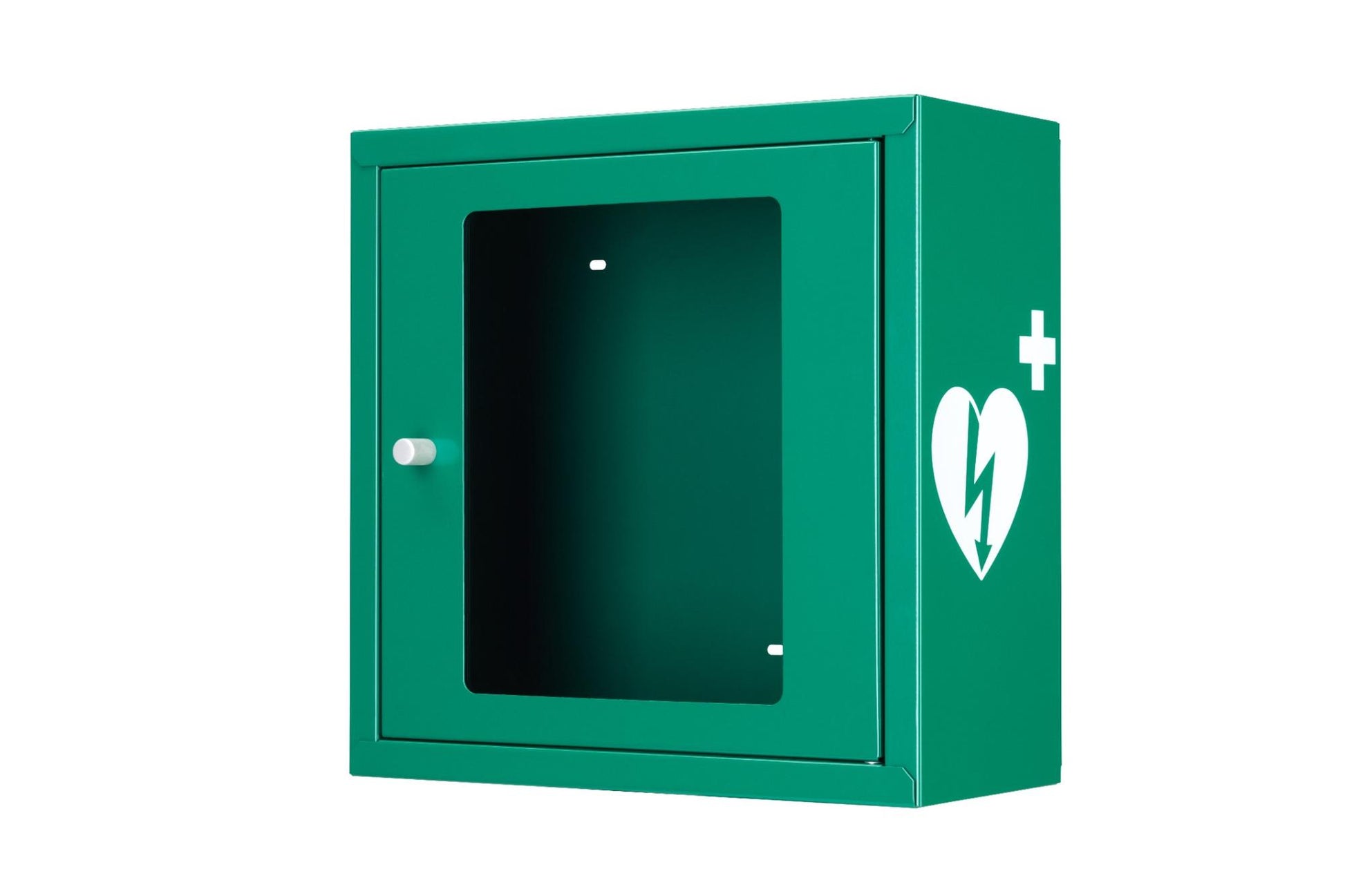 Schutzschrank mit akustischem Alarm, Notfalltafel & Tasche – signalgrün & sicher für AEDs in öffentlichen Bereichen.