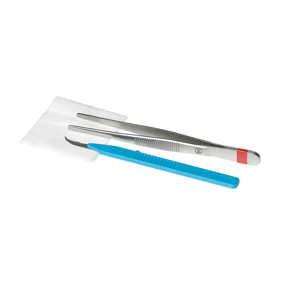 Je Set: • 1 × Mullkompresse 5 × 5 cm, 8-fach • 1 × anatomische Pinzette, gerade, 11,5 cm • 1 × Fadenziehmesser mit Handgriff