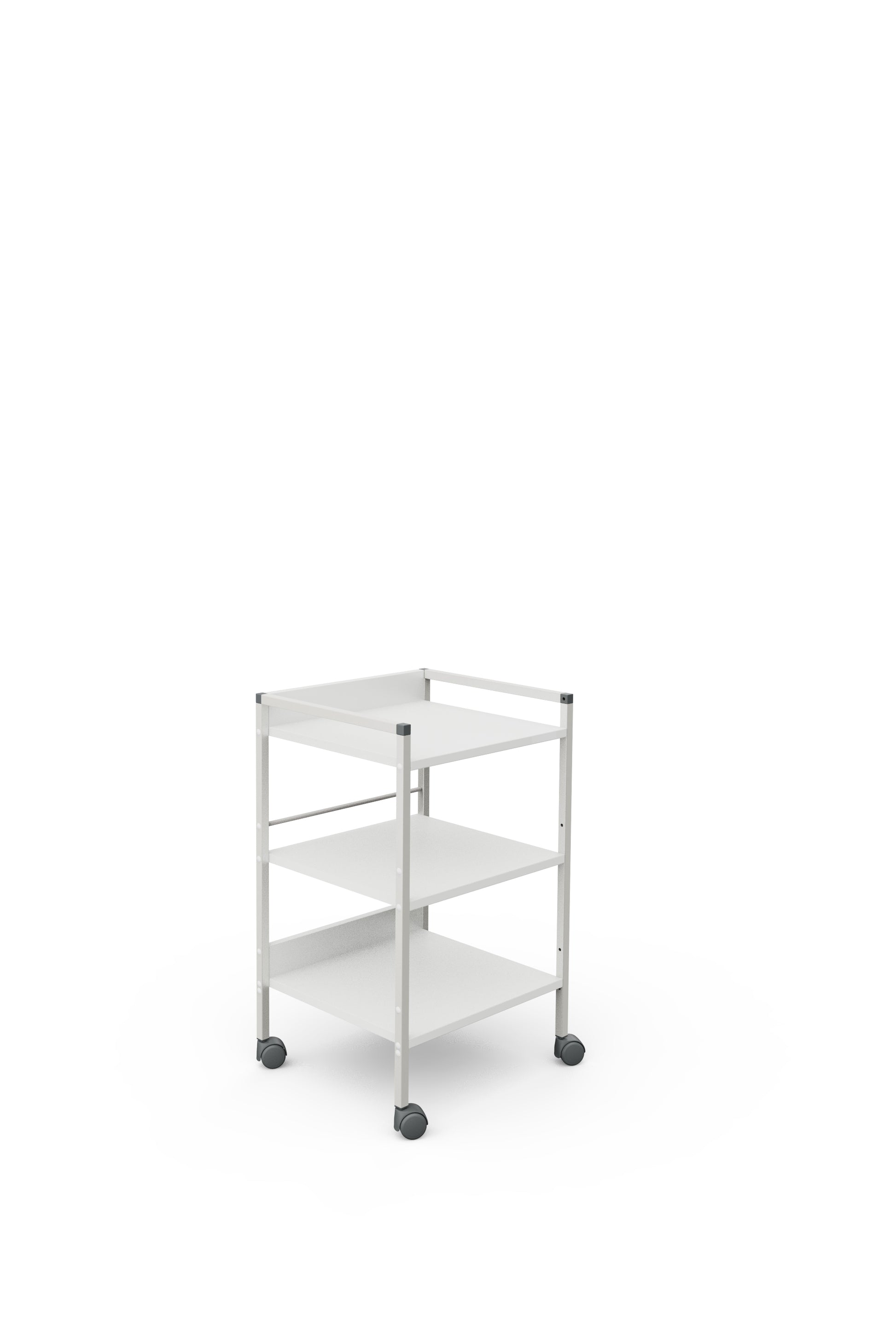 Der Regalwagen 08/16 weiß ist mit einem langlebigen Gestell ausgestattet. Die drei großen Platten bieten optimalen Stauraum, während die vier Rollen Flexibilität im Einsatz garantieren. Die hochwertig weiß beschichtete Oberfläche sowie die stabile Konstruktion machen den Wagen zur idealen Ergänzung in Praxis- und Klinikbereichen. Die obere und untere Platte verfügen über eine Aufkantung, die mittlere über eine Stabilisierungsstange.