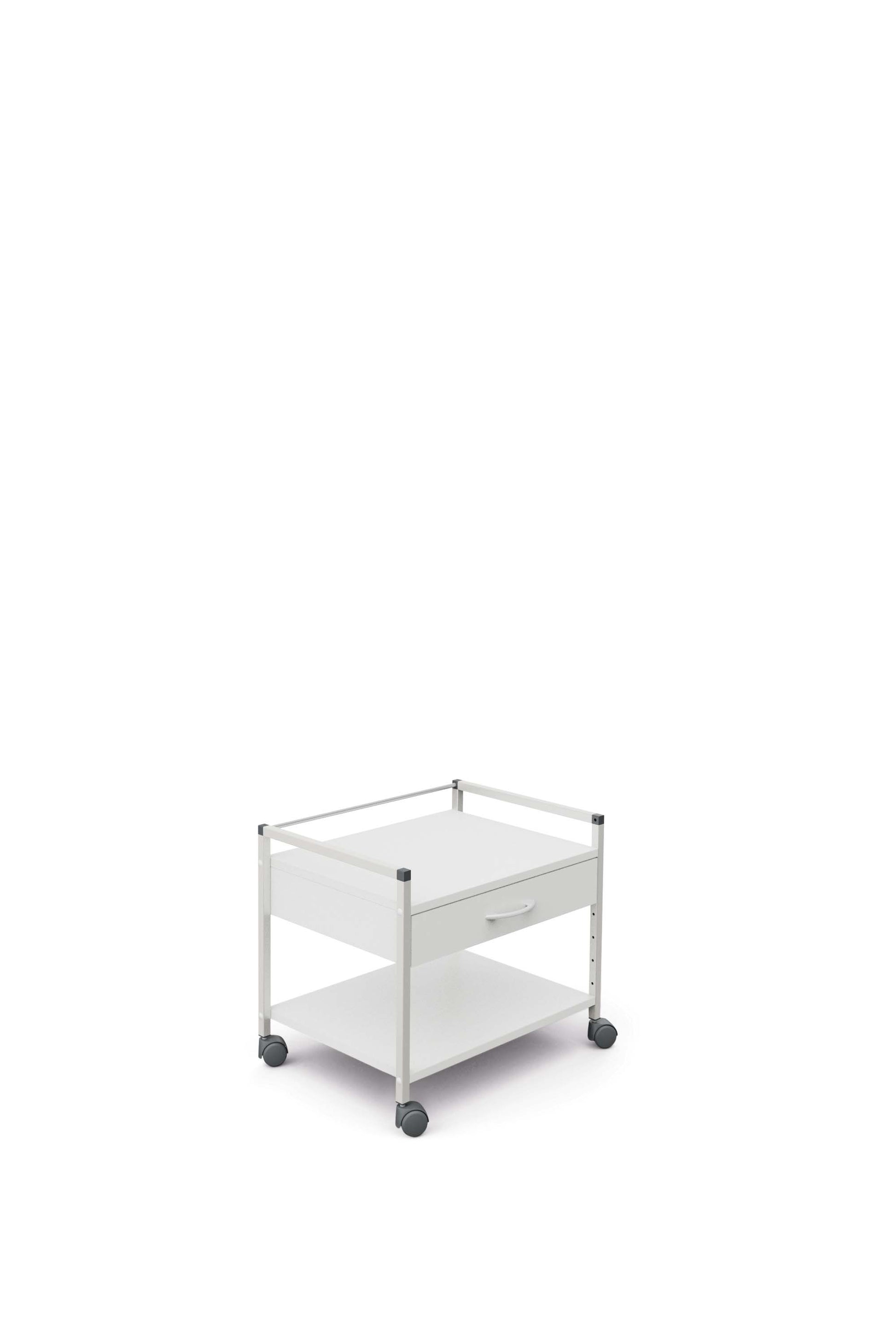 Kompakter und robuster Unterfahrwagen mit 1 bis 3 Schubladen, ideal zum Unterstellen unter Behandlungsliegen. Hochwertig weiß beschichtet und ausgestattet mit stabilen Vierkantstahlrohrbügeln und Rollen Ø 50 mm.