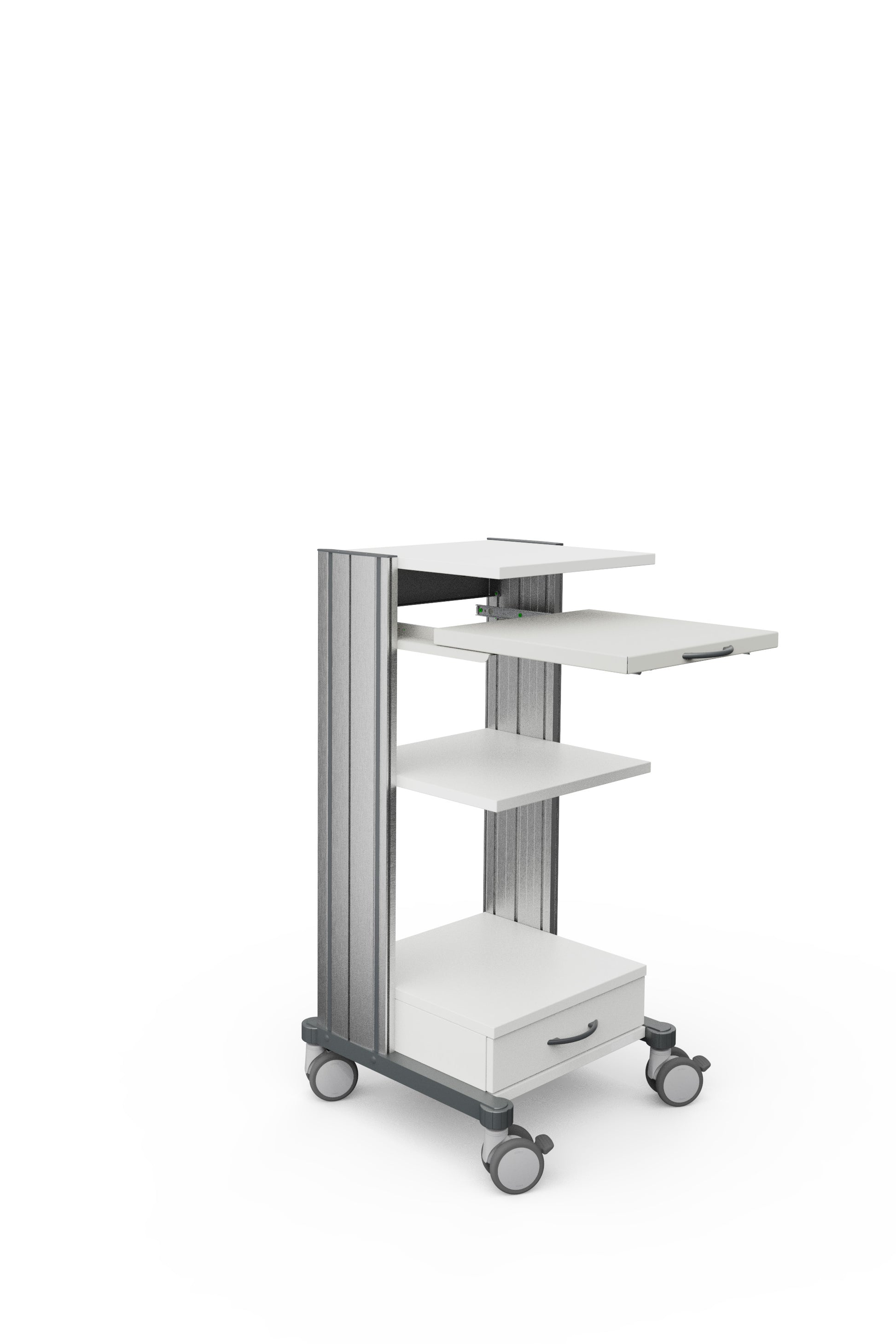 Mit drei Ablageplatten, einer leicht ausziehbaren Auszugplatte (450 mm tief, 300 mm Auszugslänge) und einer praktischen Schublade mit Griff bietet der Wagen vielseitigen Stauraum für medizinische Geräte und Materialien. Die leichtgängigen Rollen (Ø 100 mm, davon zwei feststellbar) gewährleisten volle Mobilität und sicheren Stand bei Bedarf.