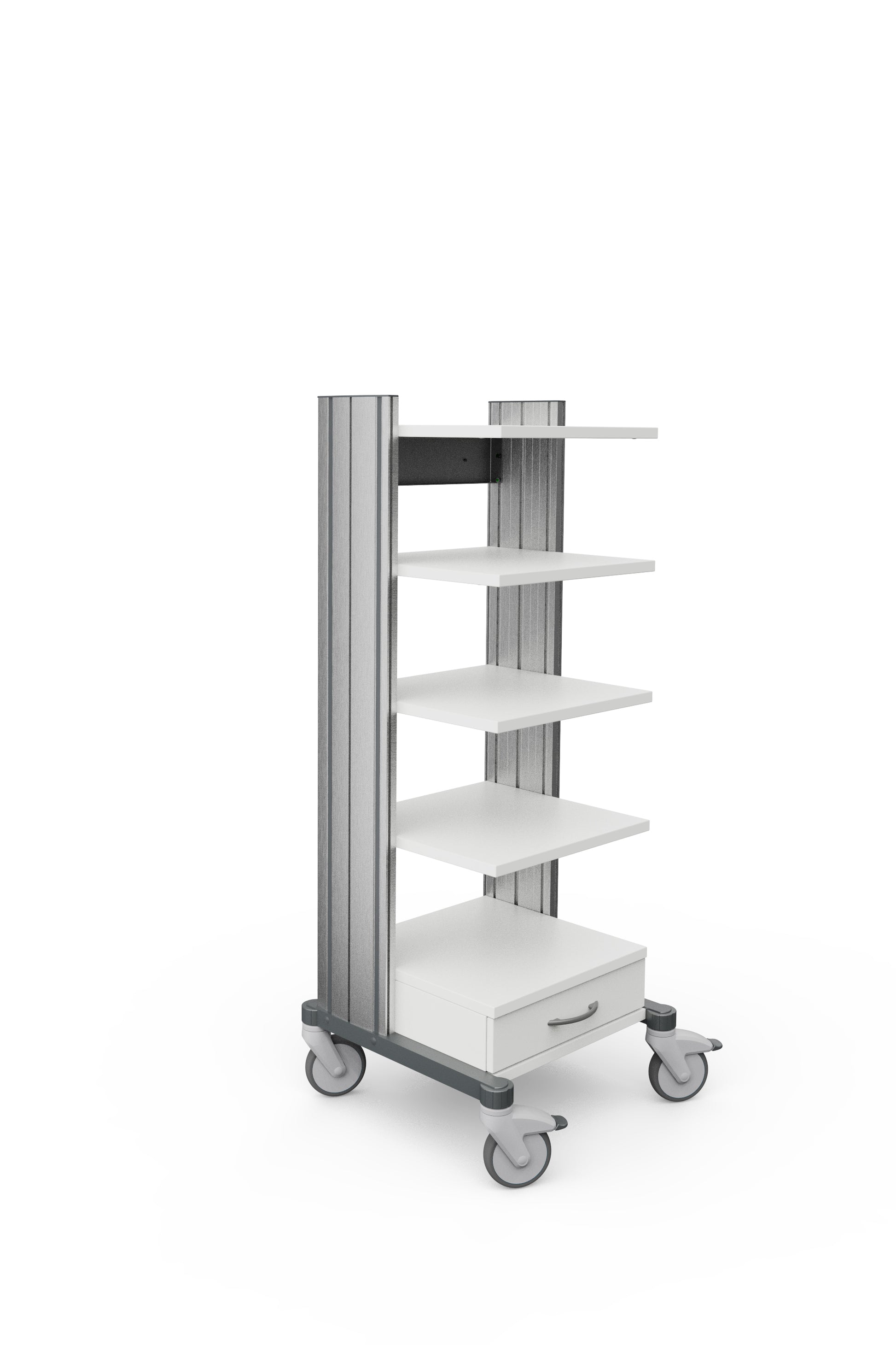 Ausgestattet mit fünf großzügigen Ablageplatten und einer Schublade mit 100 mm Höhe bietet der Wagen ausreichend Stauraum für medizinische Geräte und Verbrauchsmaterialien. Dank der vier elektrisch leitfähigen Rollen mit 125 mm Durchmesser (davon zwei feststellbar) lässt sich der Wagen sicher und flexibel im Raum bewegen.