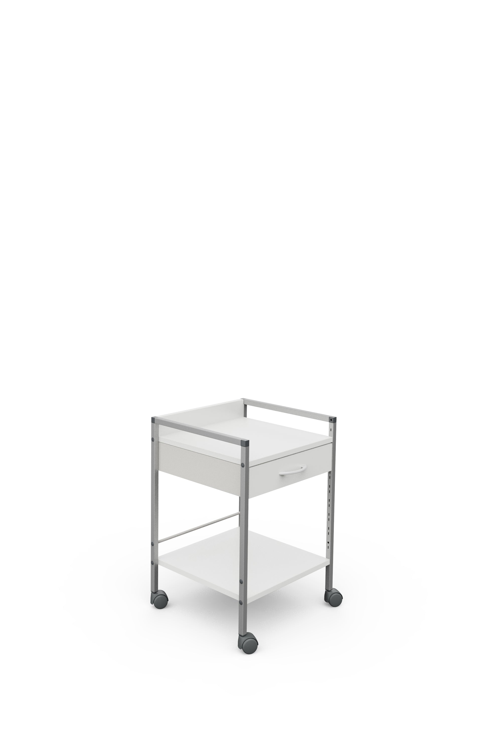 Der Variocar 45 Basiswagen weiß mit 1 Schublade und 705 mm Höhe ist eine kompakte, stabile Lösung für medizinische Einrichtungen. Das pulverbeschichtete Vierkantstahlrohrgestell bietet Stabilität, während die hochwertige Schublade mit leichtgängiger Kugelteleskopführung und Einrastmechanismus für Funktionalität sorgt. Die Platten sind fünfschichtig mit Melaminharz beschichtet – abriebfest, lichtecht und chemikalienbeständig. Die vier Rollen mit Ø 50 mm machen den Wagen wendig und flexibel.
