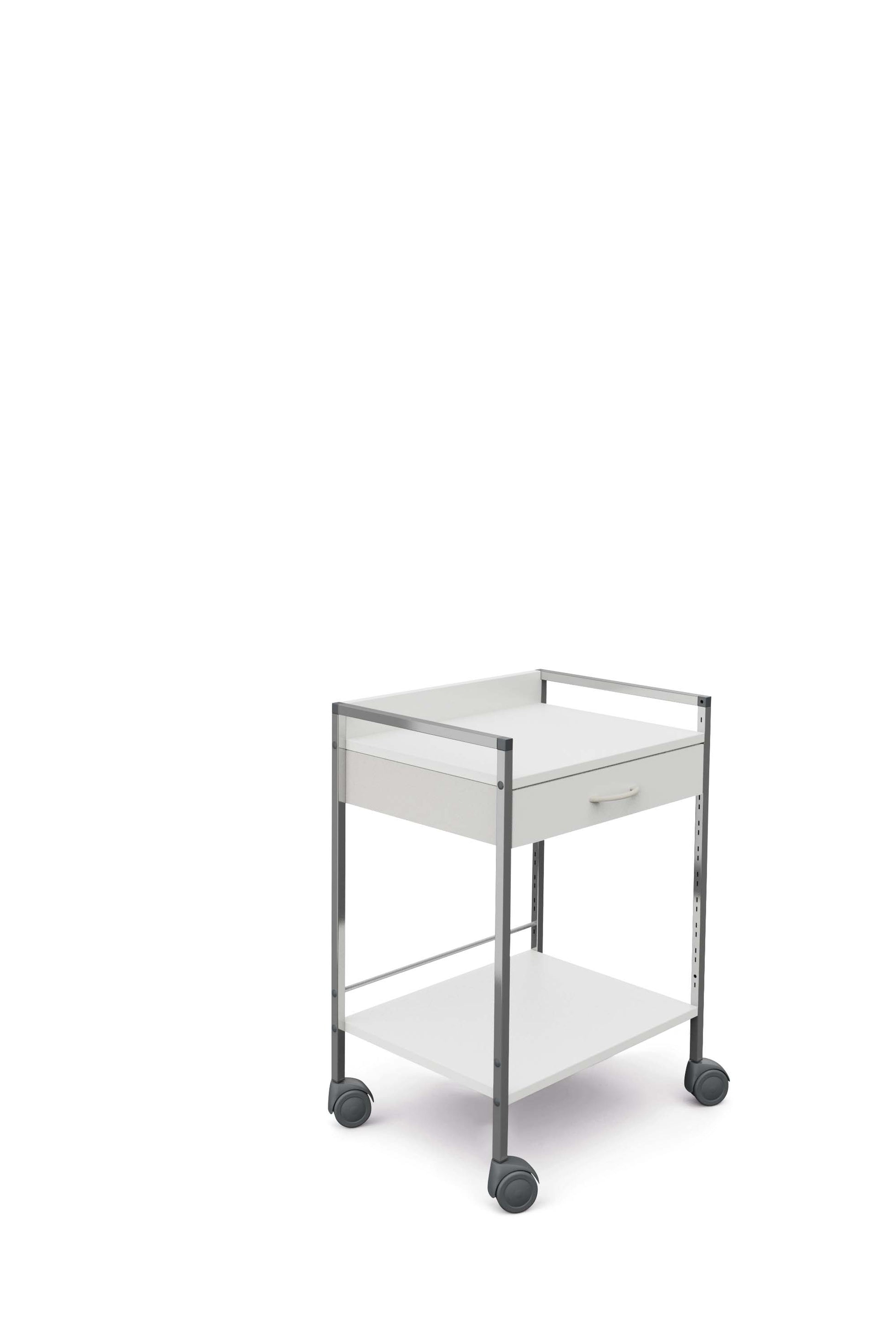 Die weißen Ablageplatten sind fünffach mit Melaminharz beschichtet – abriebfest, lichtecht und chemikalienbeständig. Die vier Rollen Ø 75 mm sorgen für Mobilität und sicheren Stand. Mit einer Gesamttraglast von ca. 50 kg ist der Wagen ein robuster Helfer im medizinischen Alltag.