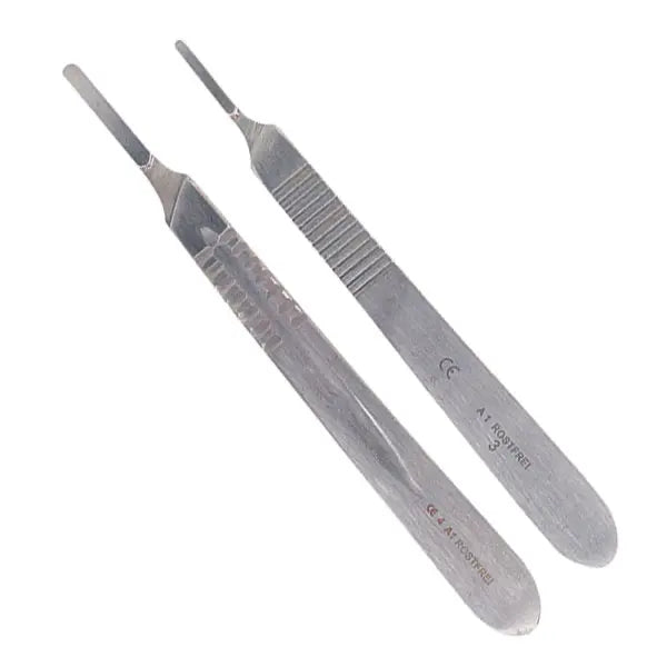 Skalpellgriff aus Edelstahl mit griffiger Oberfläche, Größe 3 (für Fig. 10–15) oder Größe 4 (für Fig. 18–25) – präzise & hygienisch.