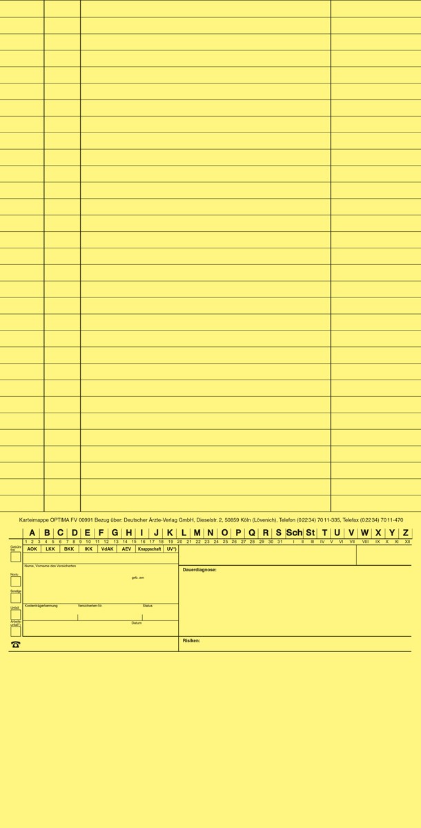 Die Alphabetleiste erleichtert die Sortierung im Karteikasten, das strukturierte Personalienfeld enthält alle Felder gemäß der eGK-Vordruckvereinbarung. Die Mappen sind zweiseitig bedruckt, sehr gut beschreibbar, langlebig und in vier Farben erhältlich – perfekt für langjährigen Praxiseinsatz.