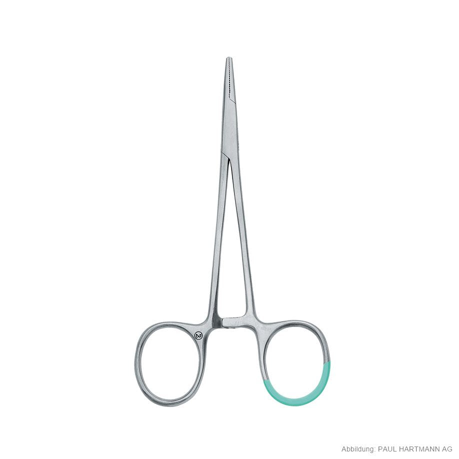 Steriler Einweg-Nadelhalter nach Mayo-Hegar, aus hochwertigem, mattem Stahl, mit präziser Verarbeitung für sicheren Halt der Nadel, Peha Colour Lock Sicherheitsmarkierung.