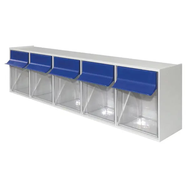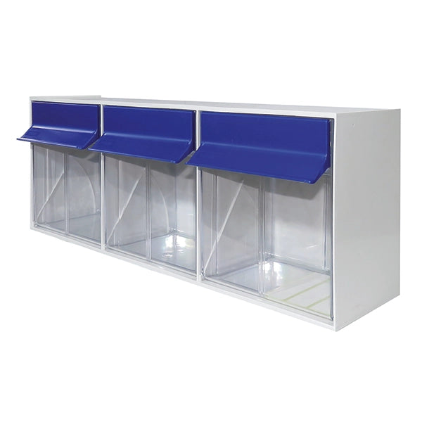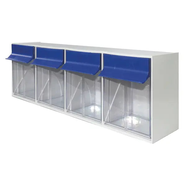 Schwenkbare, transparente Schütten in hellgrauem Halter mit blauen Griffen, für Spritzen, Kanülen & Infusionszubehör, als Standgerät oder Wandmodul, platzsparend & stapelbar, in 5 Varianten erhältlich.