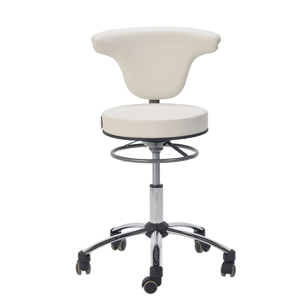 Mit einer stufenlosen Höhenverstellung von 48 bis 58 cm und einem praktischen Ringauslöser lässt sich der Stuhl optimal an unterschiedliche Arbeitshöhen und Körpergrößen anpassen. Die ergonomisch geformte, 38 cm große Sitzfläche ist angenehm weich gepolstert und mit einem pflegeleichten Kunstlederbezug ausgestattet, der sich mühelos reinigen lässt – ideal für hygienisch sensible Arbeitsbereiche.
