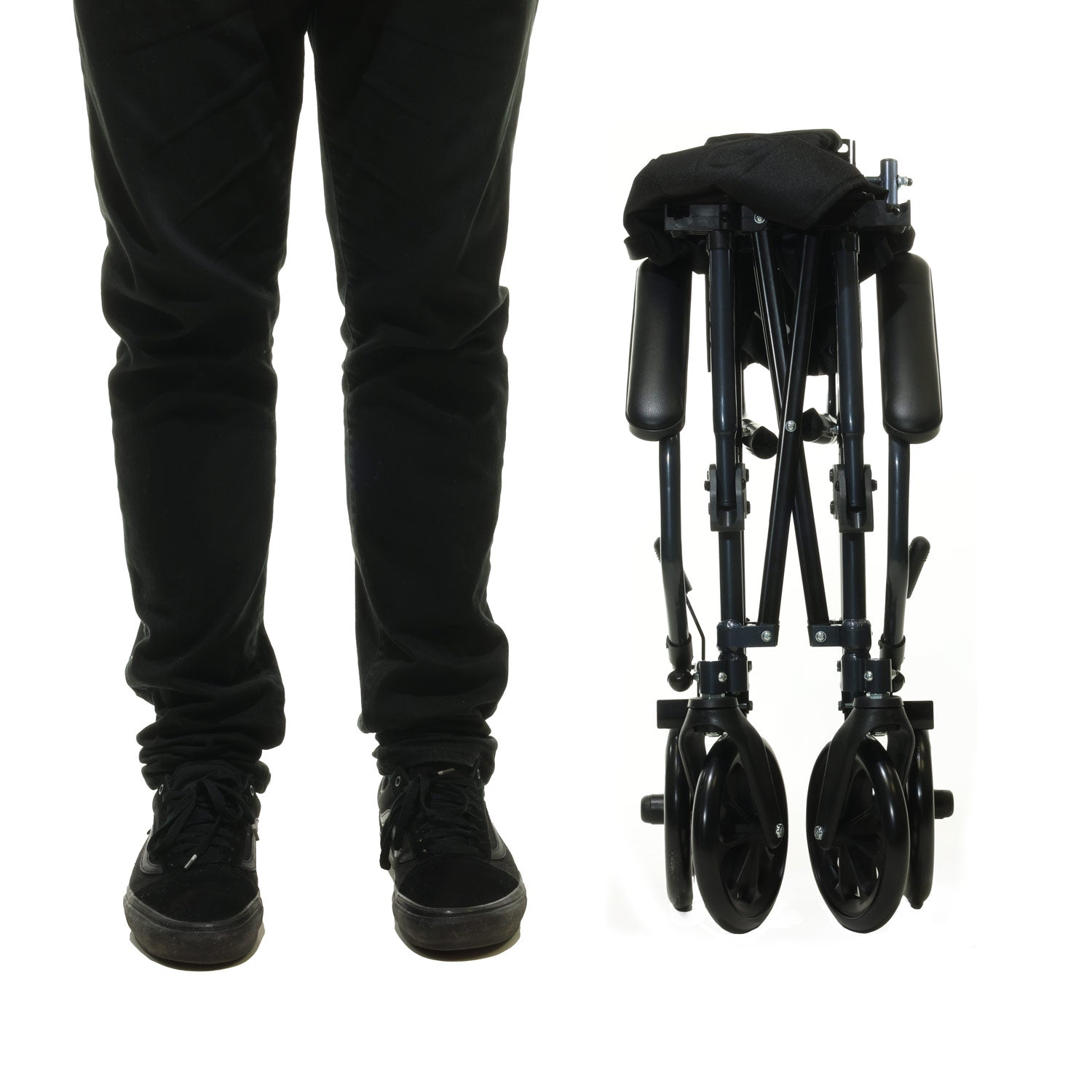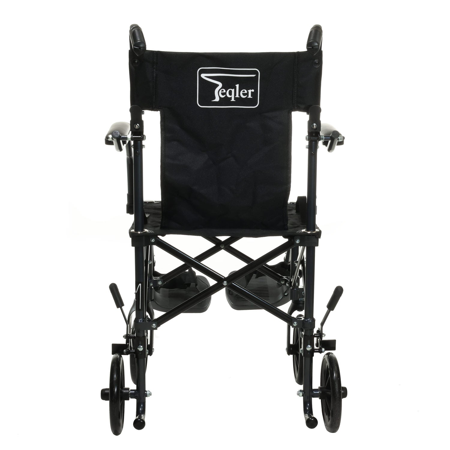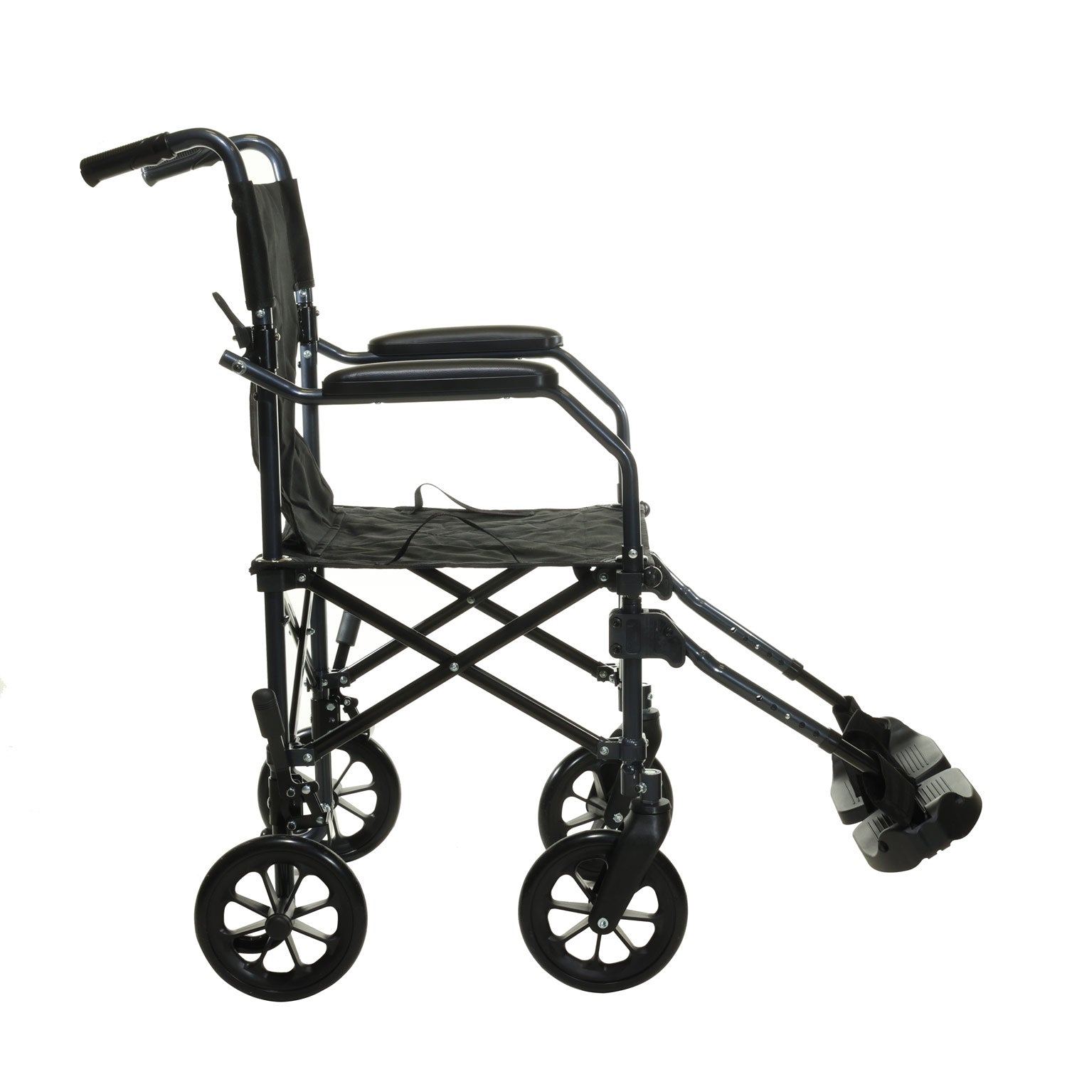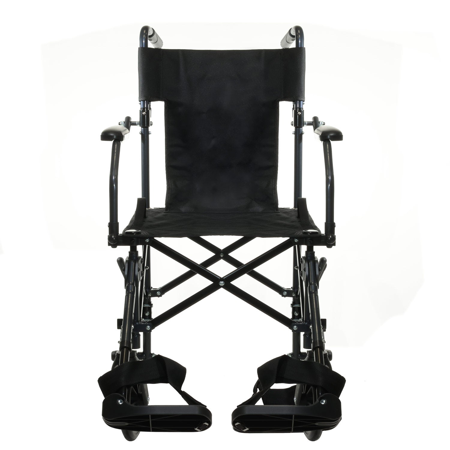 Leichter, faltbarer Transportstuhl mit gepolsterten Armlehnen, Fußstützen & Bremsen – ideal für den sicheren Patiententransport.