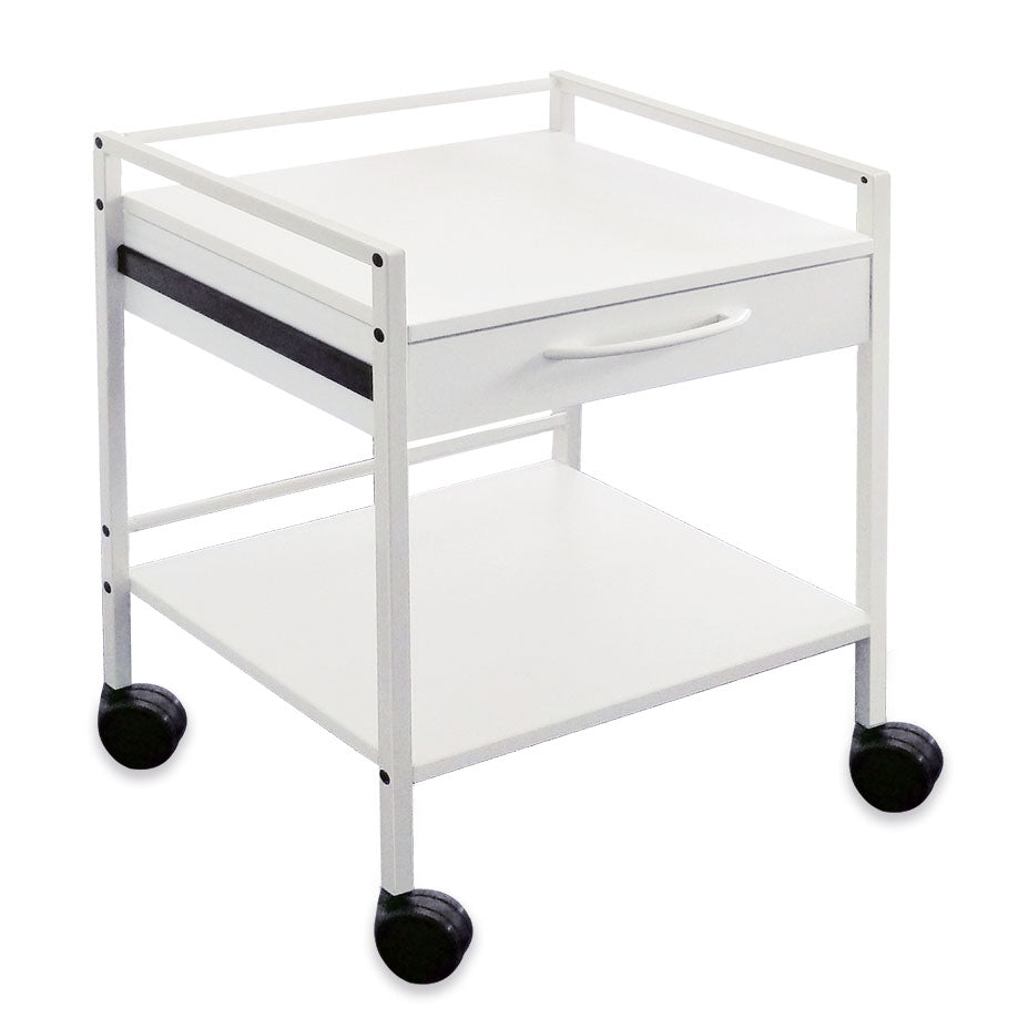 Stabiler Vielzweckwagen mit einer Schublade für den flexiblen Einsatz in Praxis, Klinik und Pflege. Pulverbeschichtetes Stahlgestell, leichtlaufende Rollen und erweiterbares Schubladensystem.